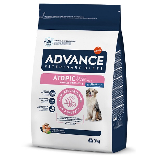 Advance Veterinary Atopic cão Medium/Maxi é um alimento dietético completo e equilibrado para cães adultos e cachorros de porte médio e grande com mais de 4 meses, formulado para cuidar da pele em caso de dermatite e perda de pêlo excessiva, bem como para diminuir intolerâncias a ingredientes e nutrientes.