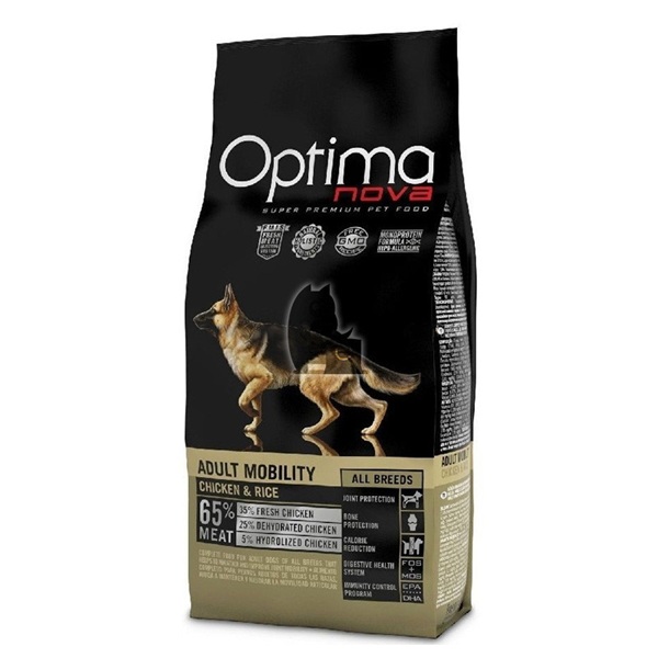 O alimento Optima Nova Adult Mobility Frango & Arroz contém EPA, DHA e ácidos ómega 3 que se encontram nos óleos naturais dos peixes, e que são facilmente absorvidos pelo corpo e ajudam a manter as articulações saudáveis e a reduzir a deterioração das cartilagens. Os problemas de falta de mobilidade estão muitas vezes relacionados com o excesso de peso e, por esse motivo, a composição desta ração contém L-carnitina que acelera a queima de gorduras e ajuda a manter os músculos nas perfeitas condições.